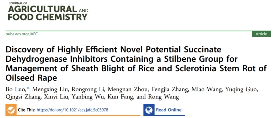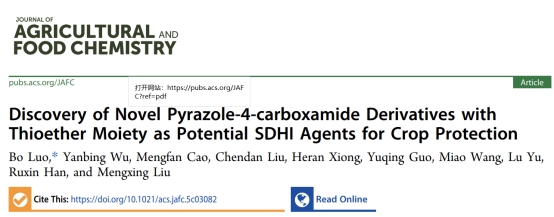 近日,公司罗波博士团队在国际知名的农林科学领域学术期刊《Journal of Agricultural and Food Chemistry》上发表了两篇学术论文。题目分别为《Discovery of novel pyrazole-4-carboxamide derivatives with thioether moiety as potential SDHI agents for crop protection》(DOI: 10.1021/acs.jafc.5c03082)和《Discovery of highly efficient novel potential SDHIs containing stilbenes group for management of sheath blight of rice and sclerotinia stem rot of oilseed rape》(DOI: 10.1021/acs.jafc.5c03978)。